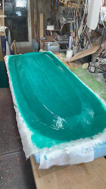 #200グラスクロスをせきそう、通常サーフボードは白い発泡材(高硬度)にグラスクロスを直貼りますがいぴいずくりの制作になり、私としては面倒な作業が多く、模型飛行機で蓄積したノウハウのシャーレ工法で作ってみました。